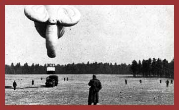 in its floor. The balloon was tethered by cable to a winch vehicle, which steadily allowed the `blimp'
